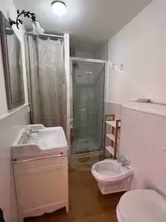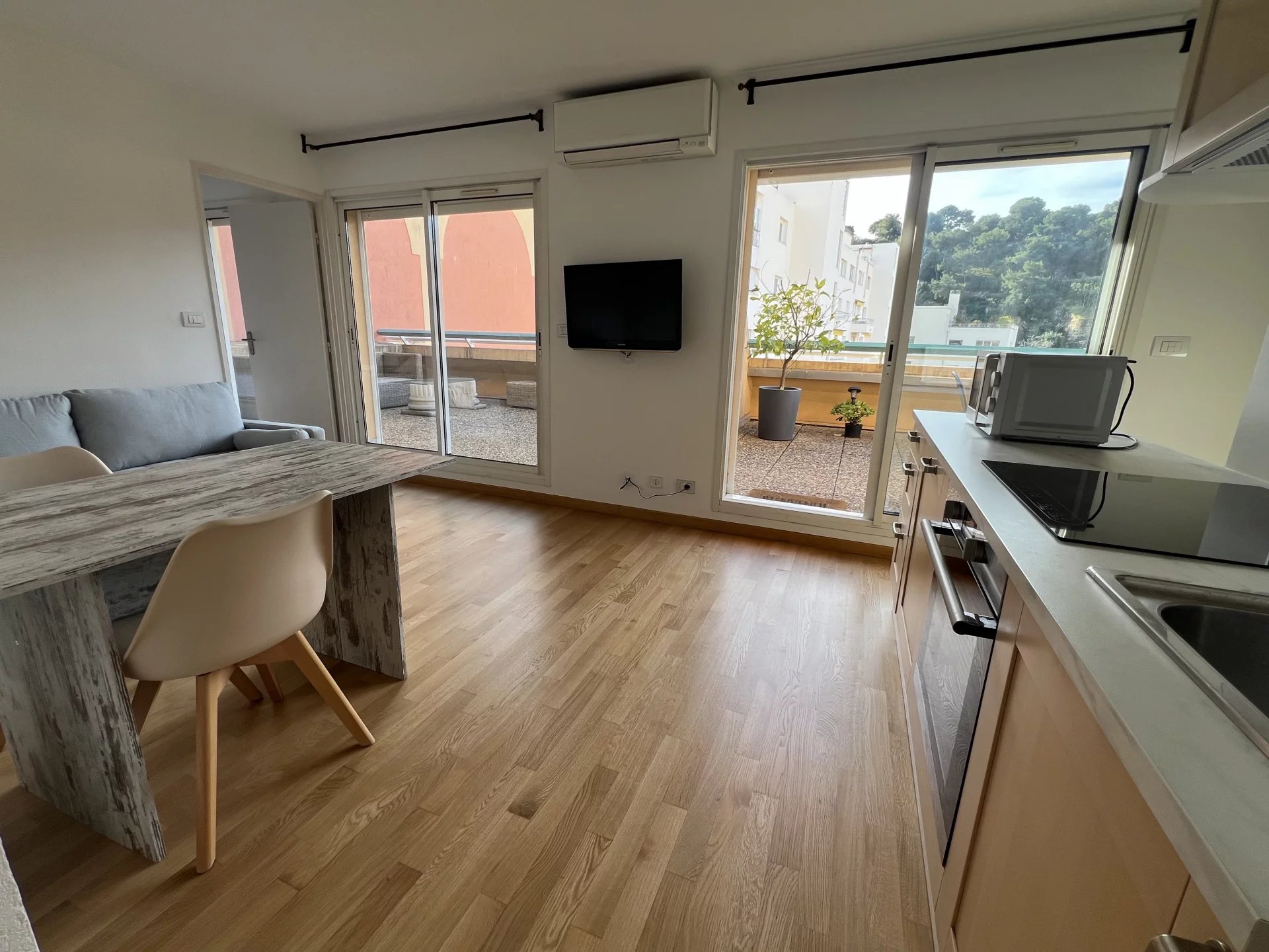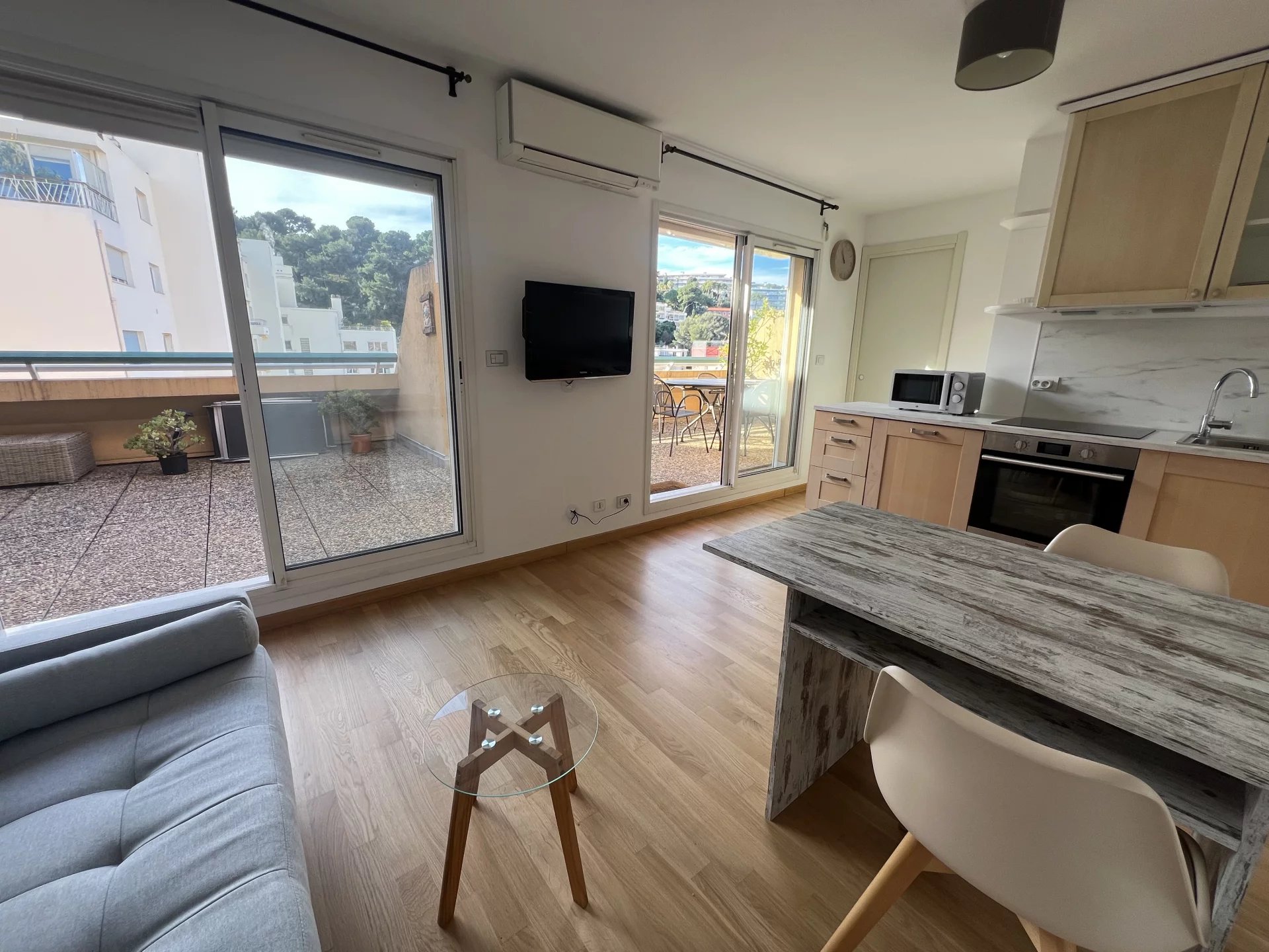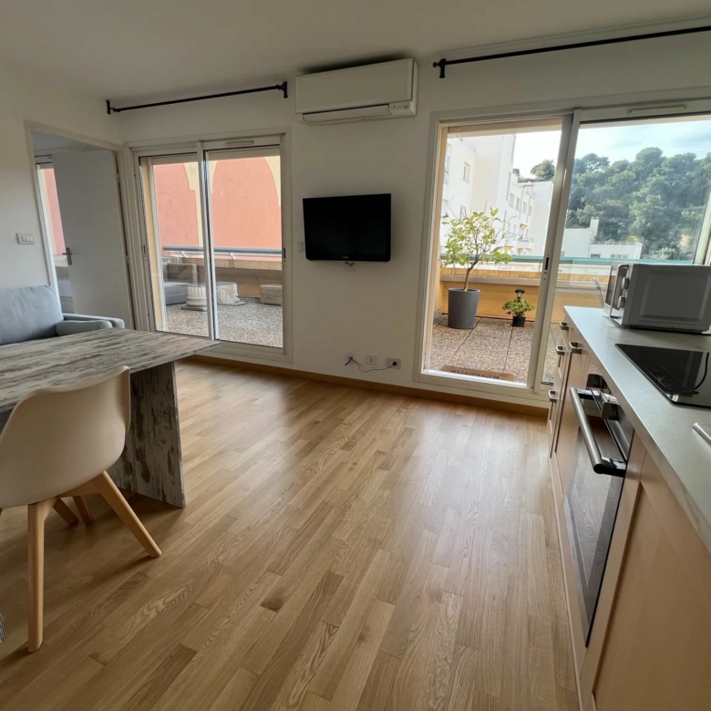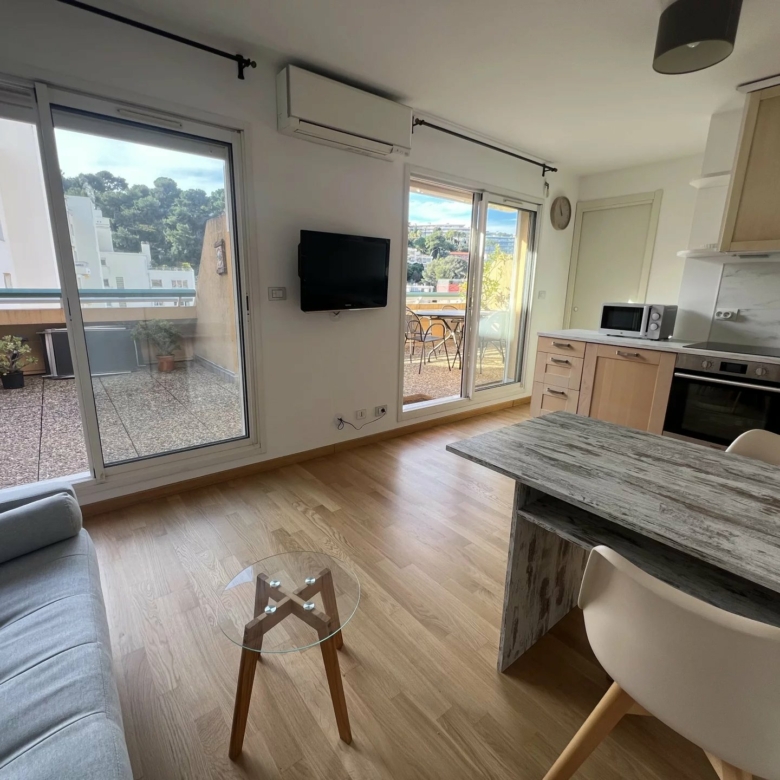 Séjour avec coin cuisine équipée (lave-vaisselle, four, plaque de cuisson, réfrigerateur/congelateur) placard mural, chambre avec grand placard mural, salle d’eau avec wc et bidet, le tout ouvert sur une large terrasse de 35m² environ exposée sud-ouest, au calme.