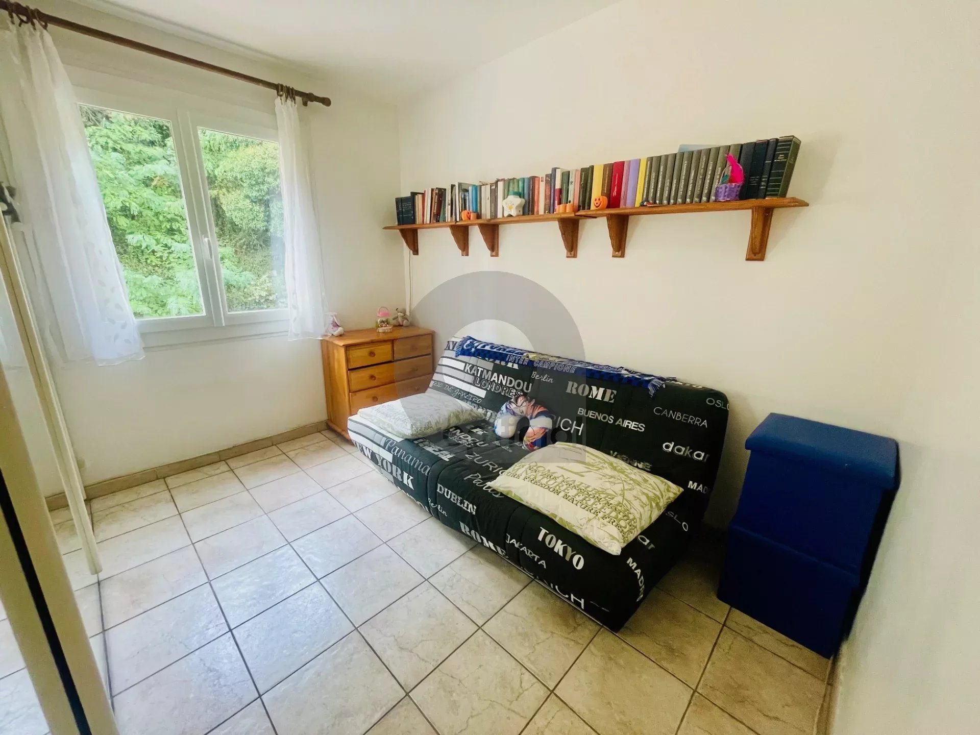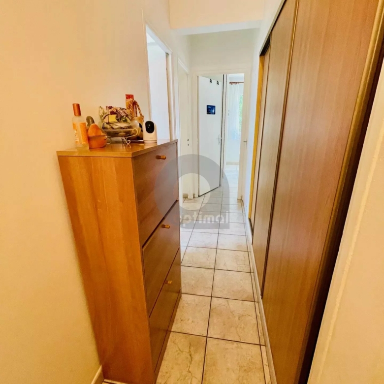 Couloir avec placards de rangement, WC indépendants, salle de douche avec fenêtre, 2 agréables chambres a l’arrière au calme et vue dégagée sur la colline.