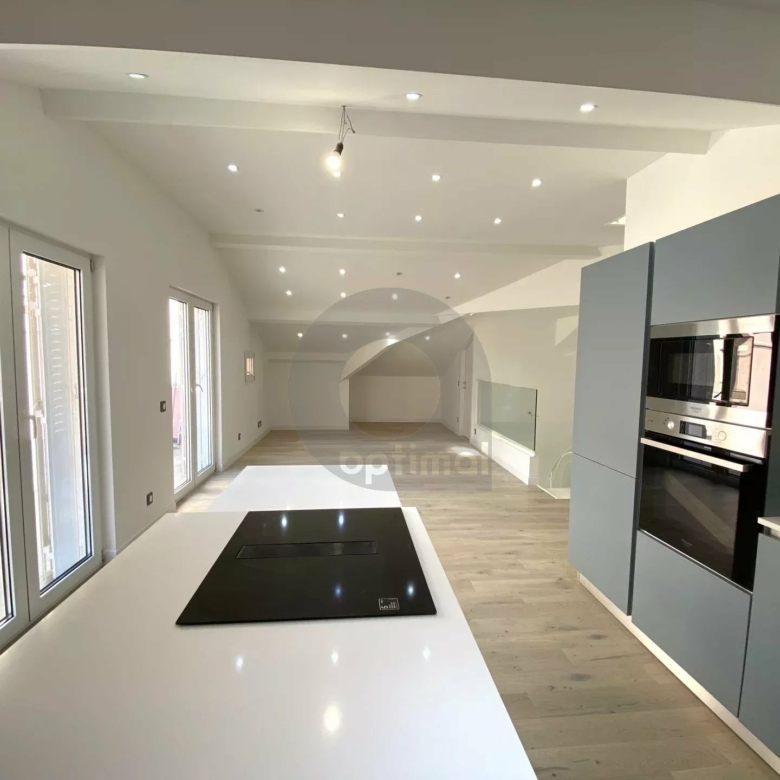 In the town of Menton, on the top floor of a very beautiful residence from the 1920s, large three-room apartment of 62m2 renovated with quality materials. The apartment consists of an entrance with staircase leading to the 43m2 living room, open kitchen with numerous storage spaces and wine cellar, two bedrooms, two shower rooms with toilets. Large terrace of 38m2 facing Southwest. Great brightness. No work required. Ideal primary or secondary residence.