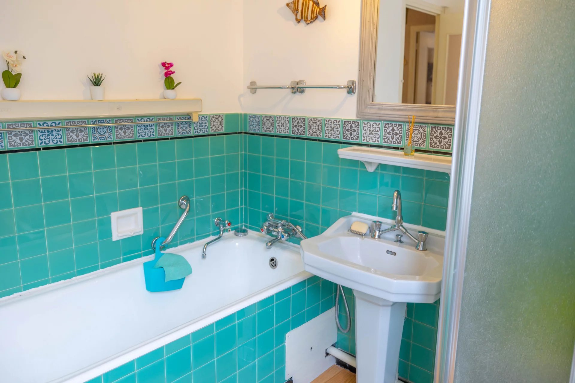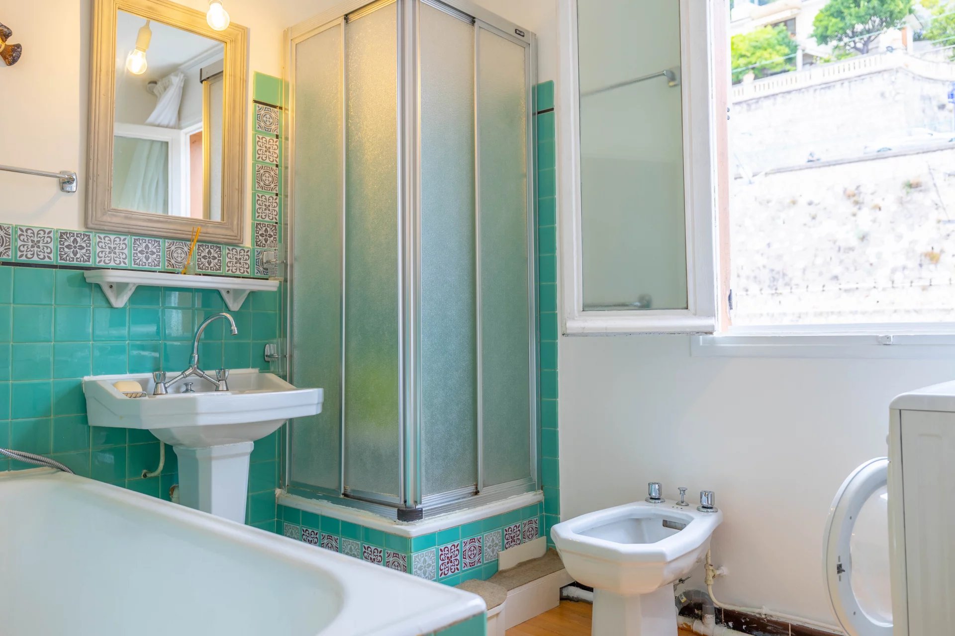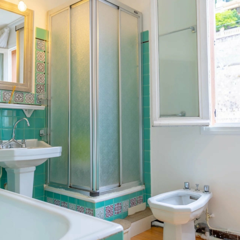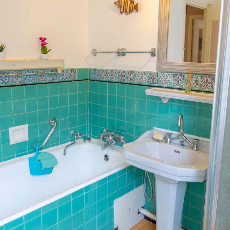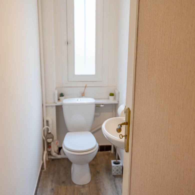 La salle de bains dispose d’une baignoire, d’une douche et d’un bidet, complétée par des WC séparés pour plus de confort.