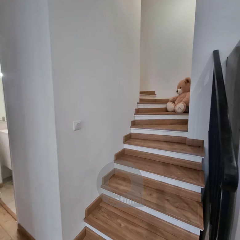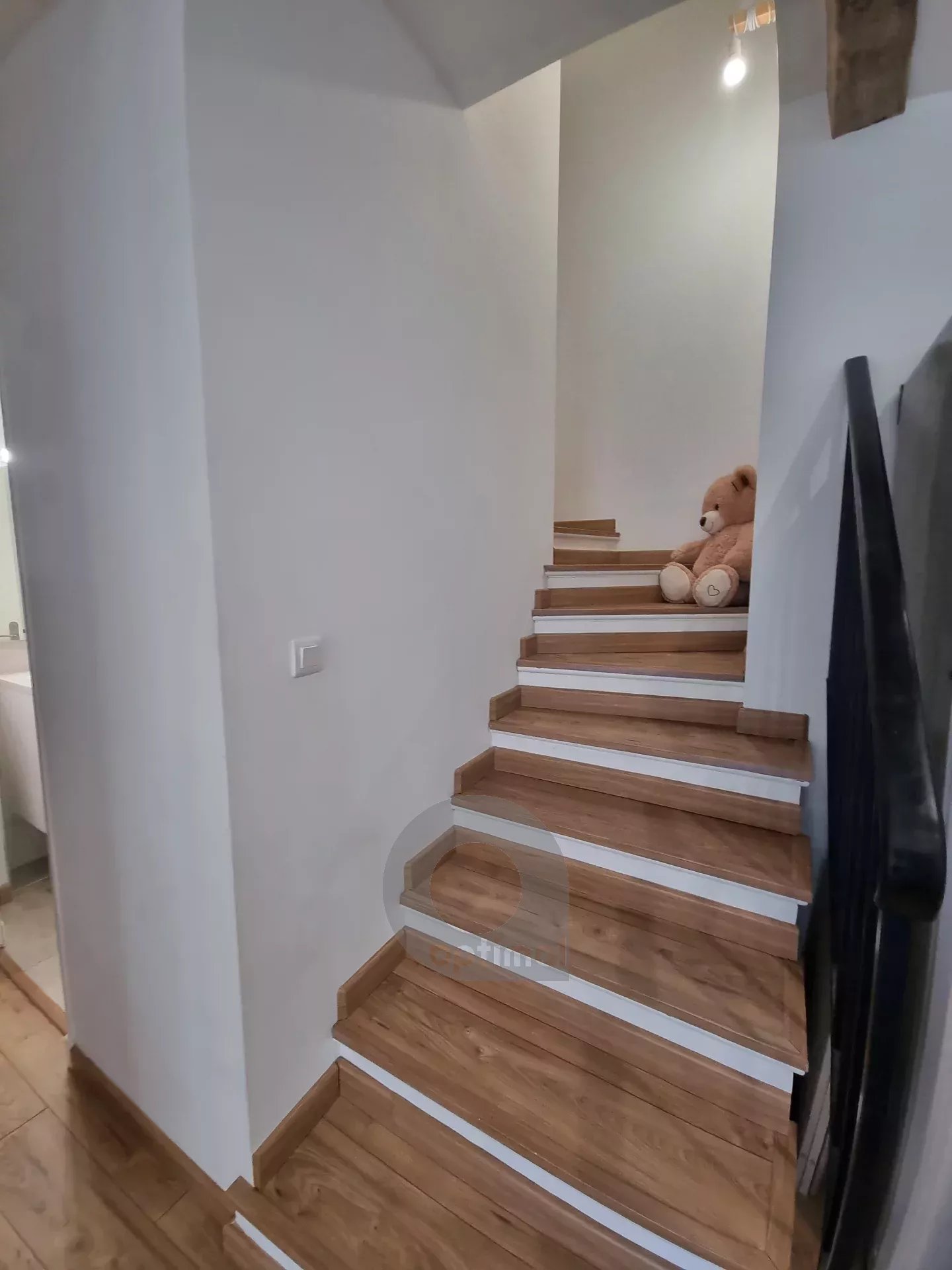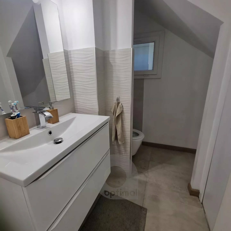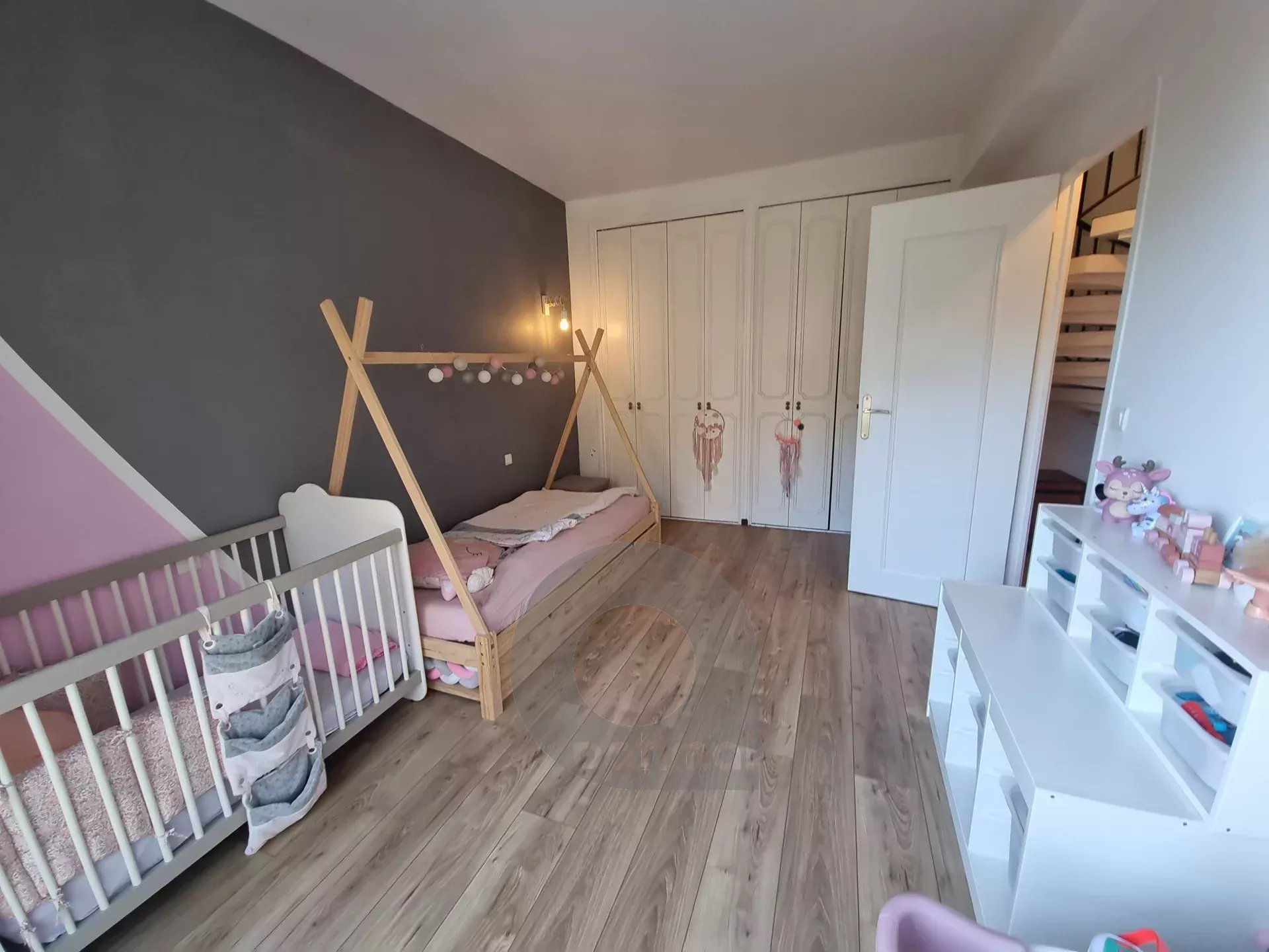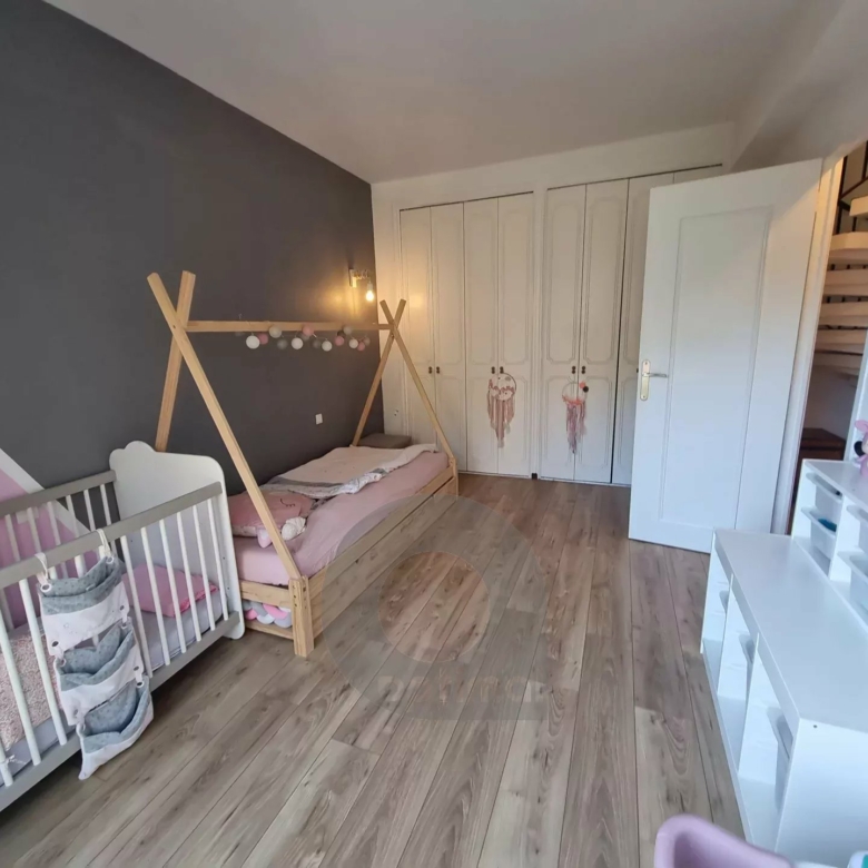 – au niveau inférieur se trouvent 2 grandes chambres avec placards. Ces 2 pièces séparées par une salle de bain avec WC sont ouvertes sur un balcon.