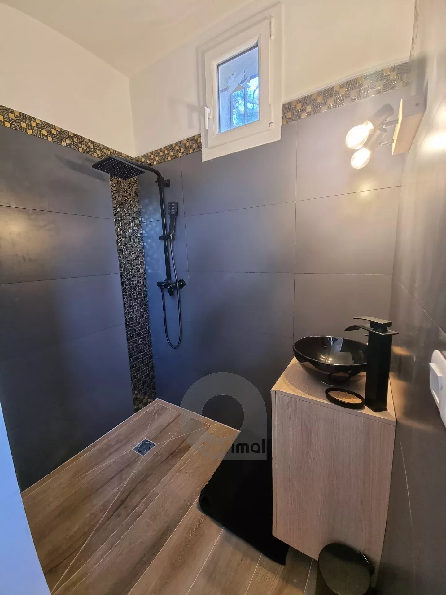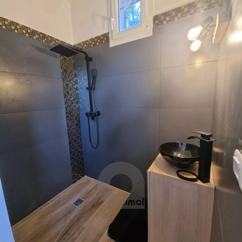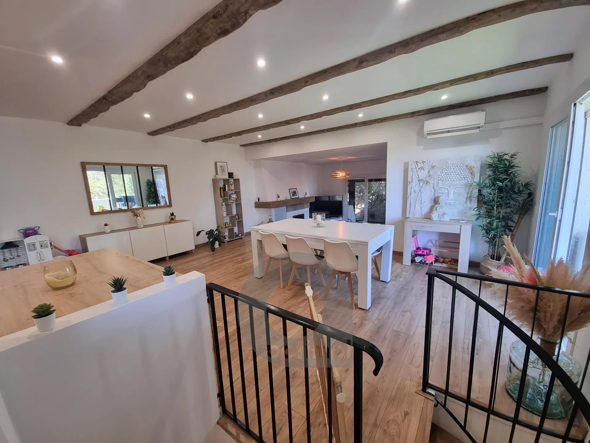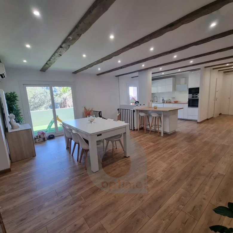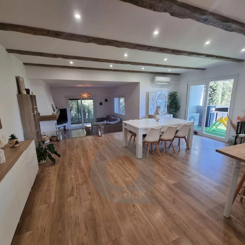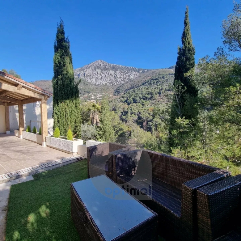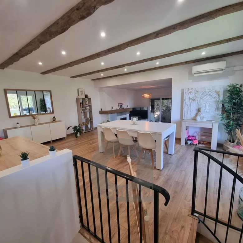 – d’un RDC avec placard, buanderie, WC indépendant, une spacieuse pièce de vie d’environ 58 m2 avec climatisation réversible avec une cuisine ouverte sur la salle à manger et le salon, pièce dans laquelle a été installé un insert à bois. Une magnifique véranda dans la nature vient compléter cette pièce. Une très belle terrasse d’environ 30m2 ouverte sur la salle à manger et la cuisine, exposée Est, avec une vue exceptionnelle sur les montagnes, Le Berceau, ainsi qu’un aperçu mer.