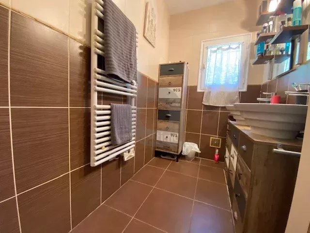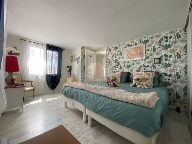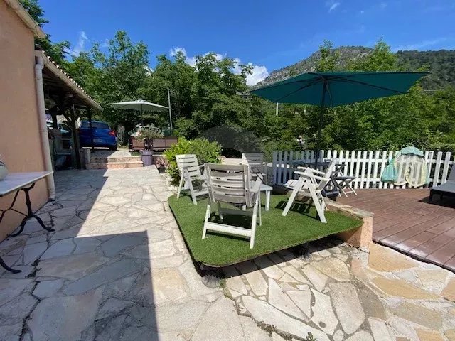Au 1er étage : trois chambres, une salle de douche et un toilette indépendant. Le tout donnant sur une terrasse avec une seconde maison de 80 m² composée de :