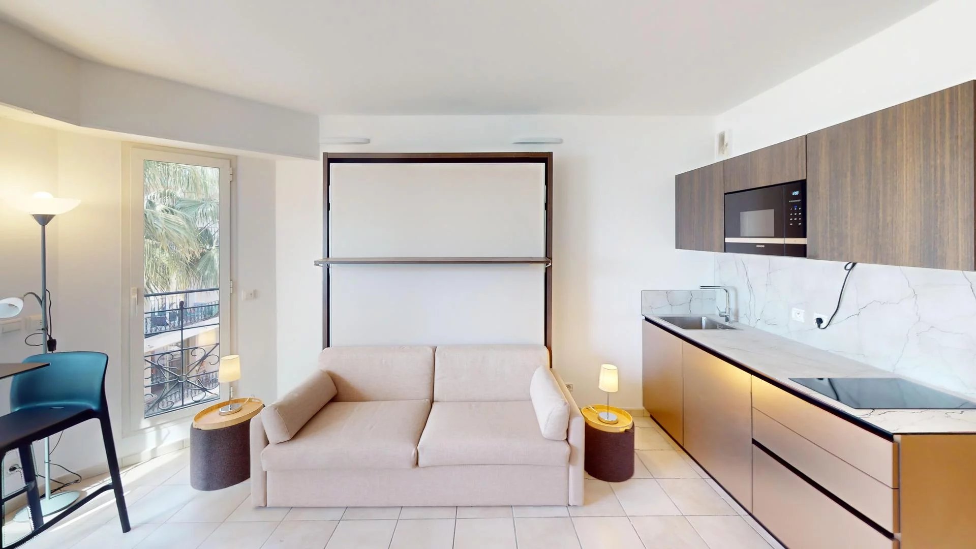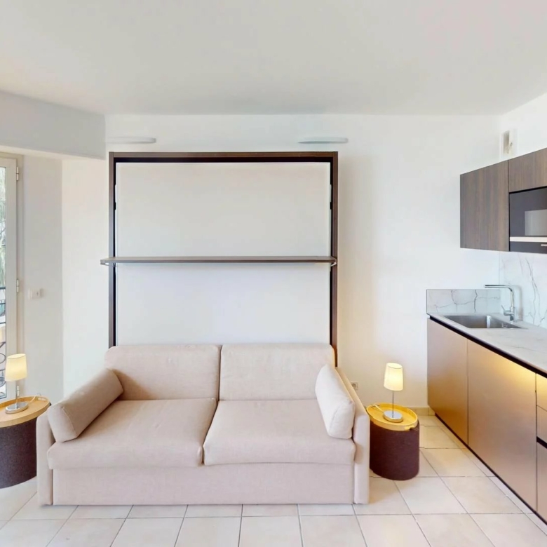 Séjour avec lit rabattable 160x200cm et TV écran plat.
