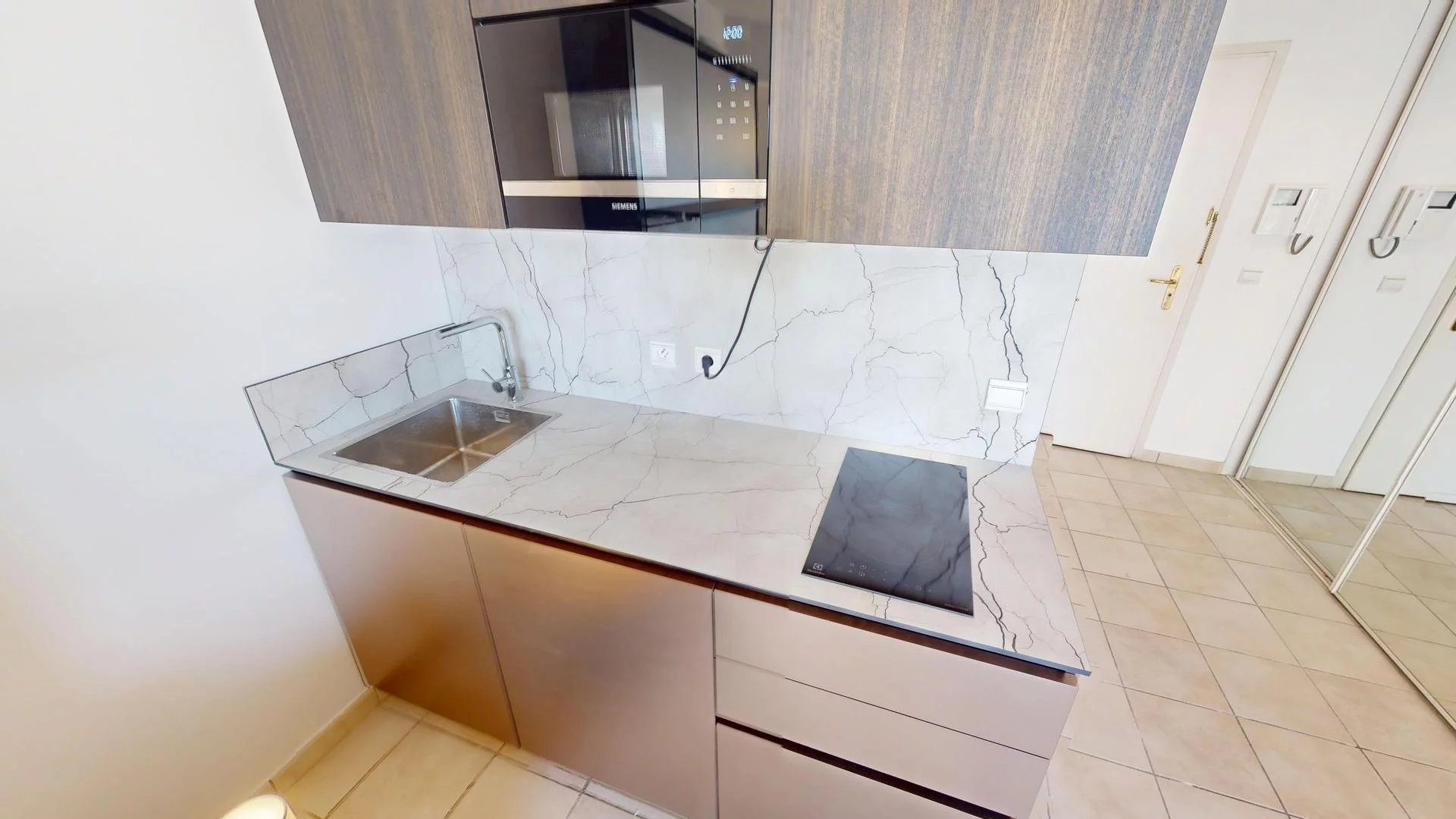 Coin cuisine dans le séjour équipé de réfrigérateur/congélateur, plaque induction 2 feux, lave-vaisselle, microonde et cafetière type Nespresso.