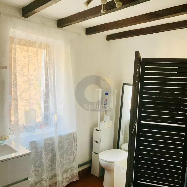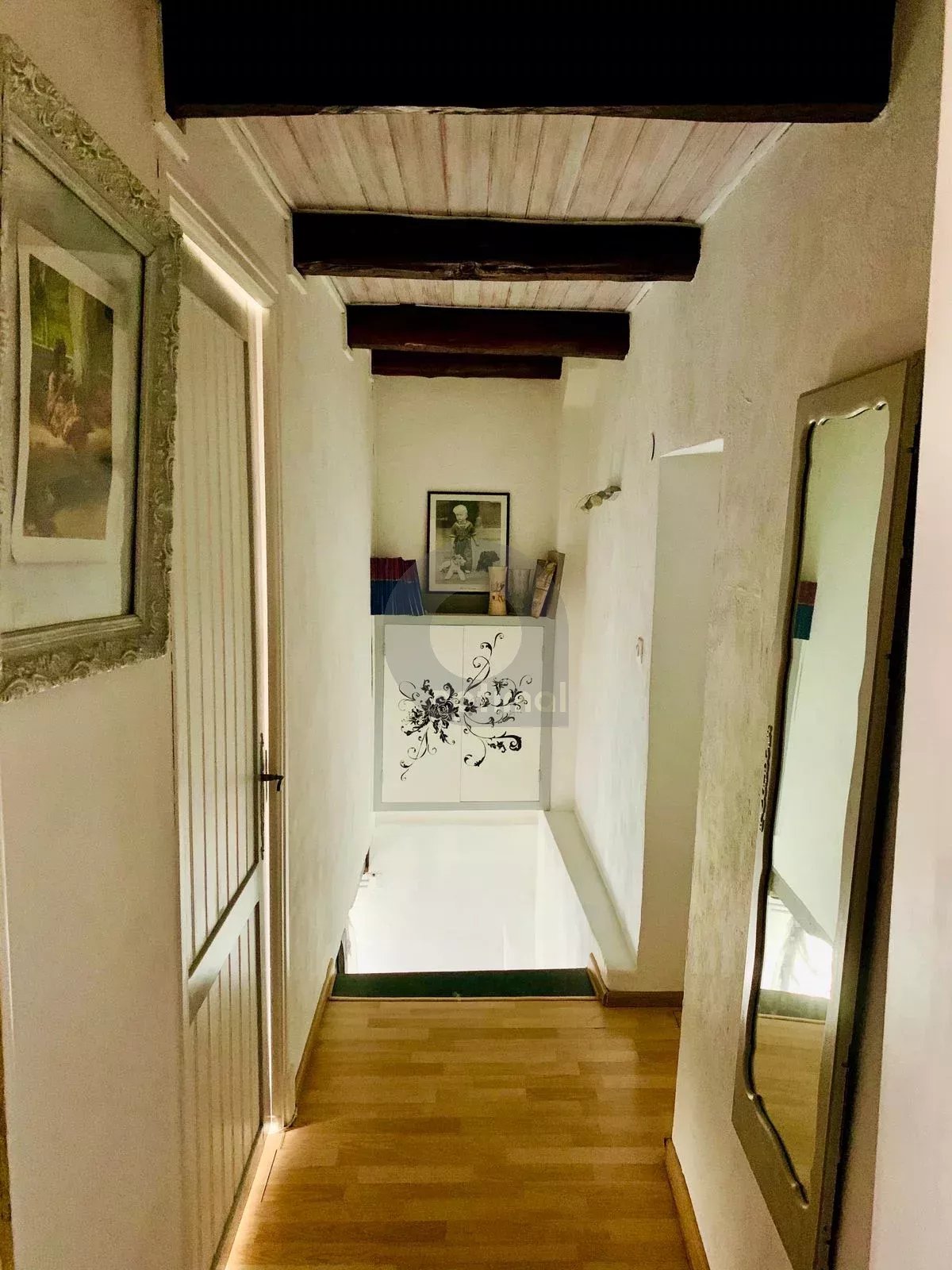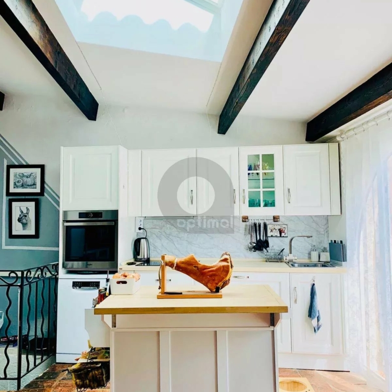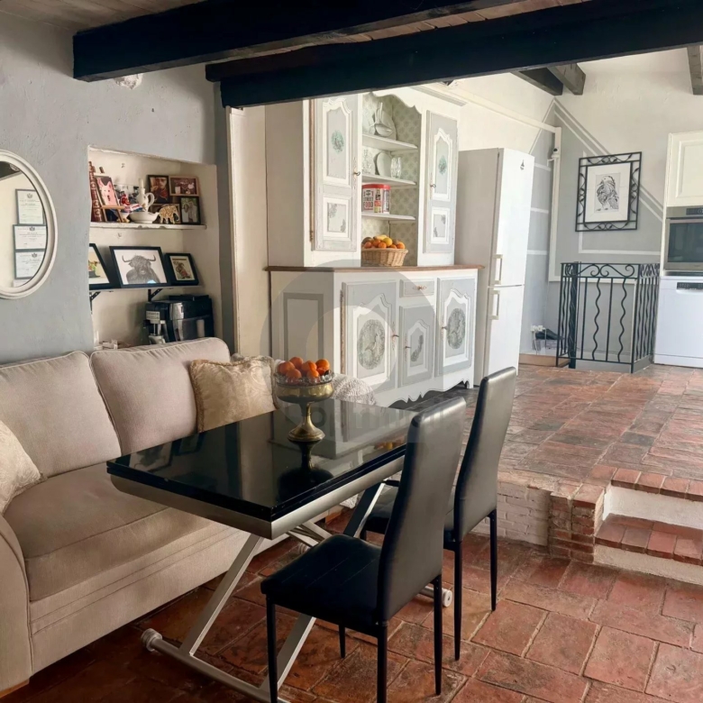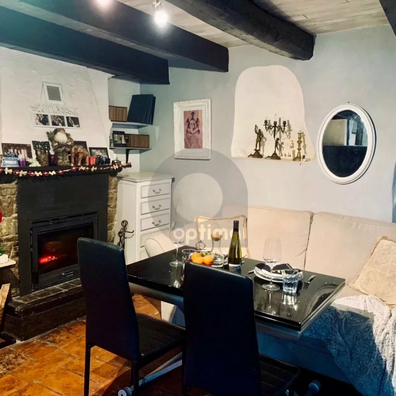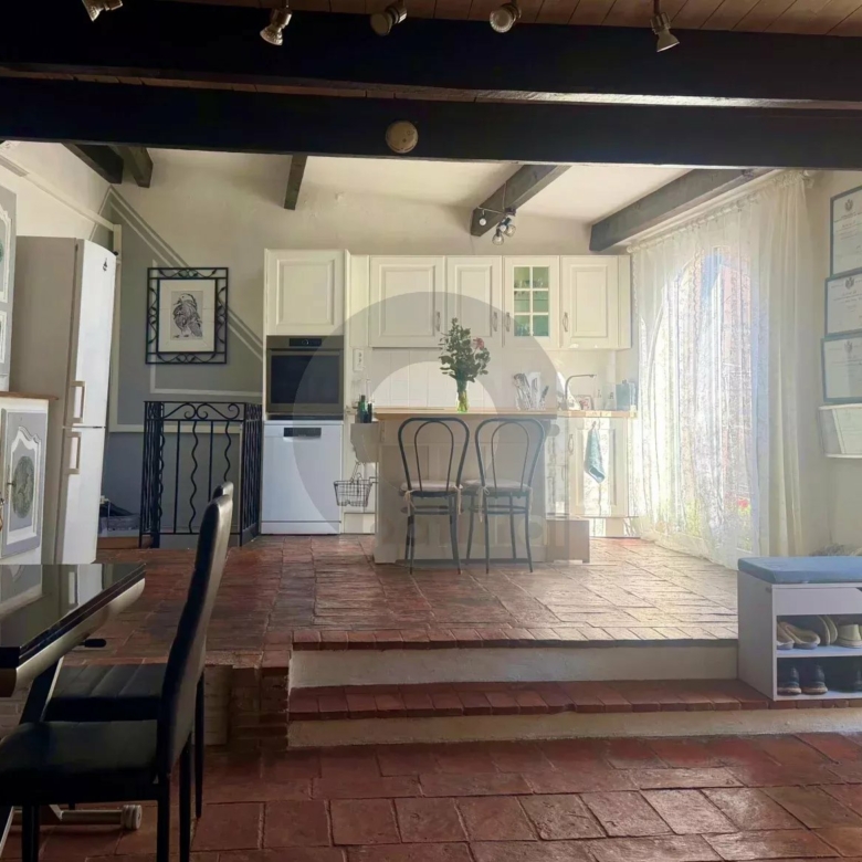 Au 1er niveau: une cuisine américaine équipée ouverte sur le séjour avec cheminée (insert), donnant sur une terrasse de 17m2, une chambre avec toilette et lavabo.