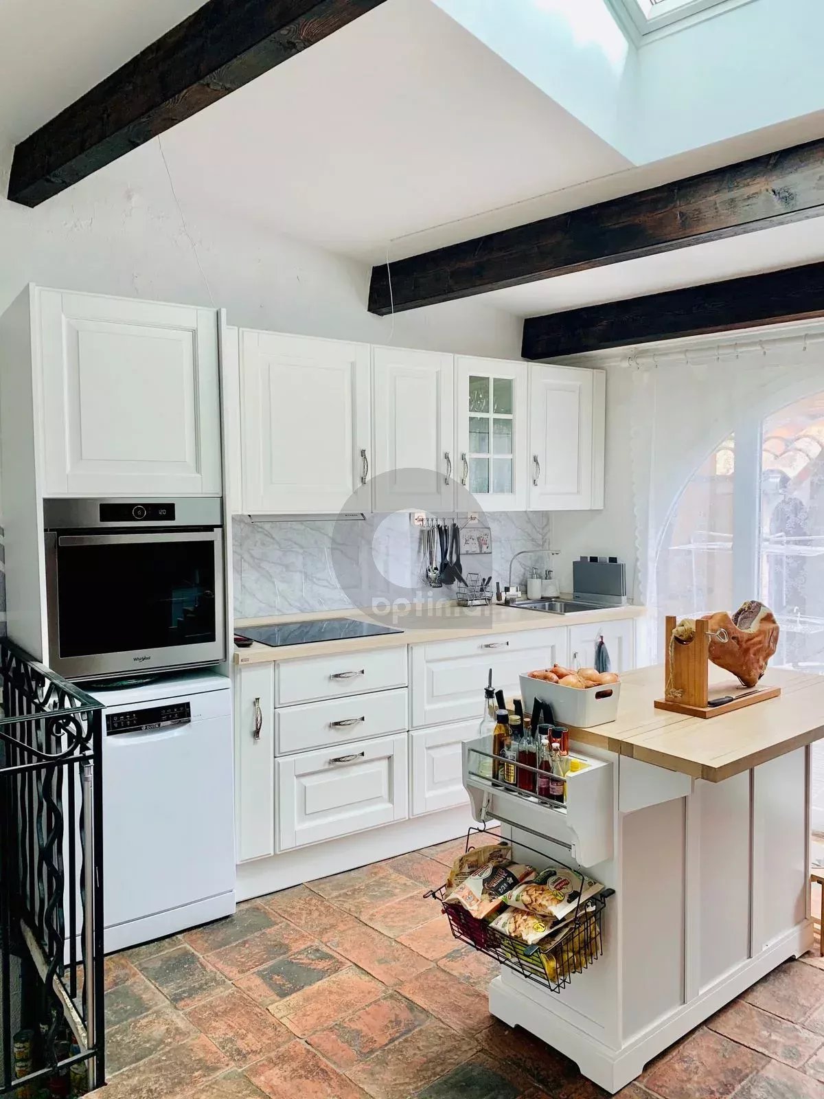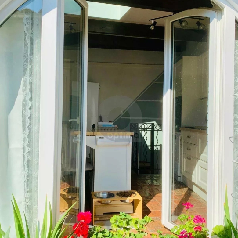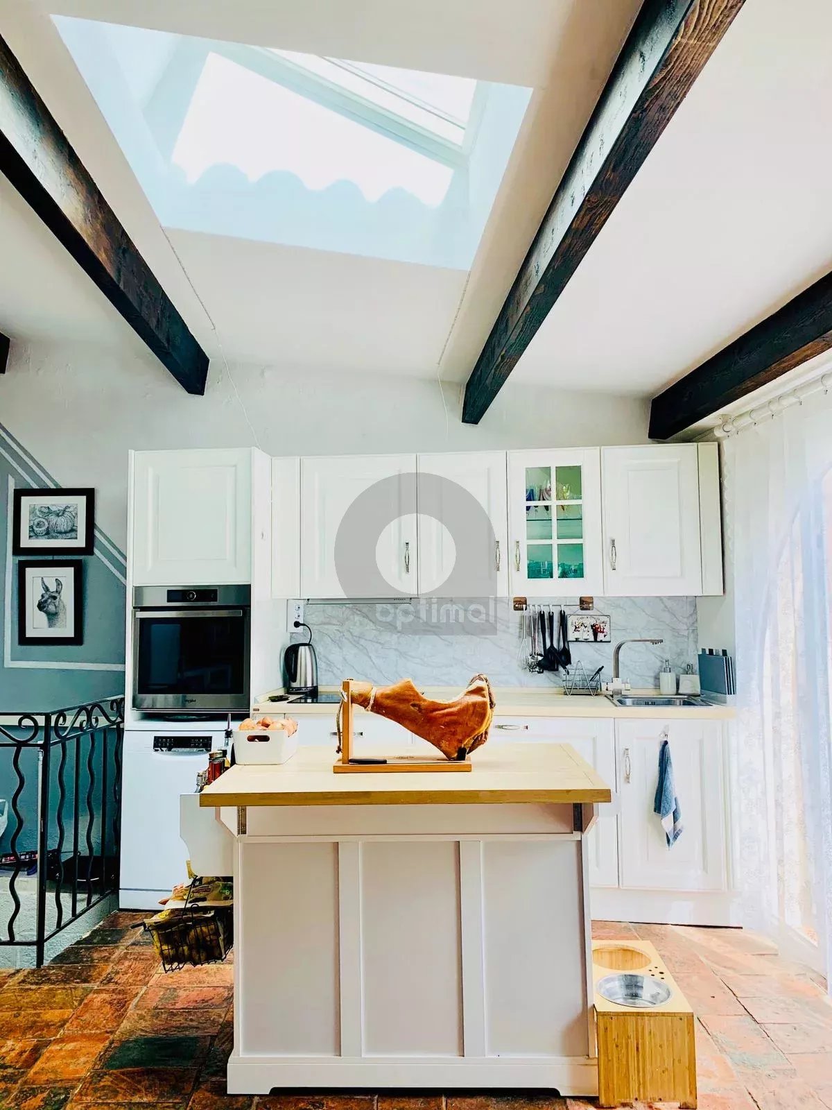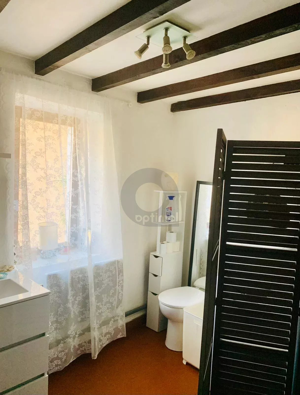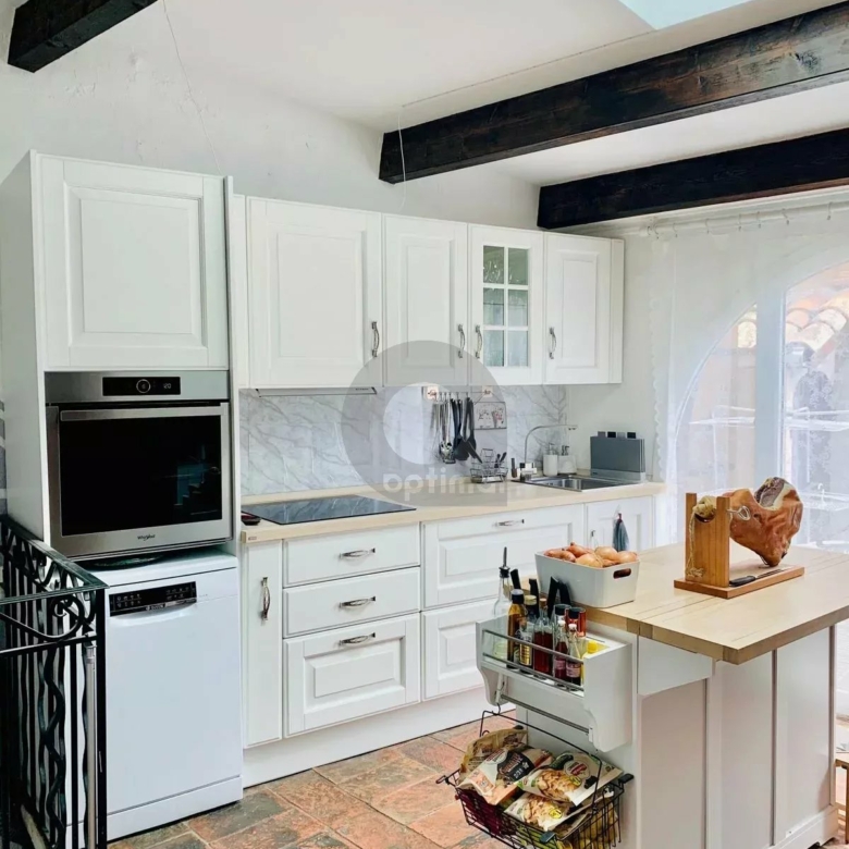 Au 1er niveau: une cuisine américaine équipée ouverte sur le séjour avec cheminée (insert), donnant sur une terrasse de 17m2, une chambre avec toilette et lavabo.