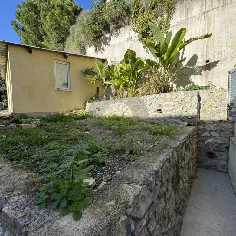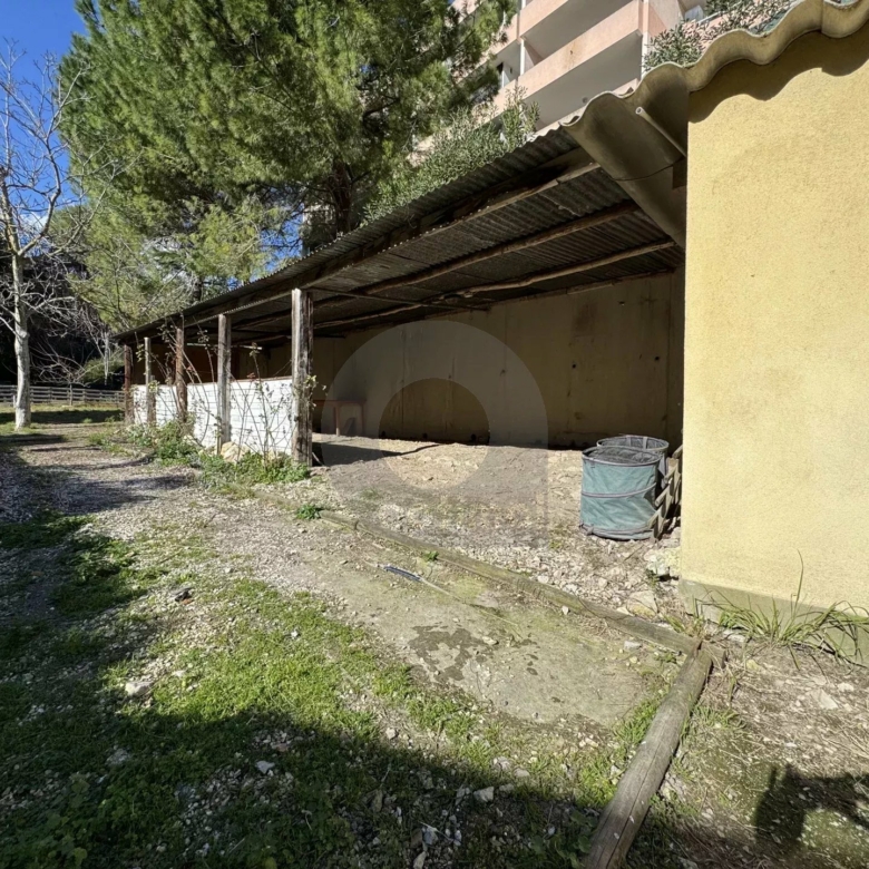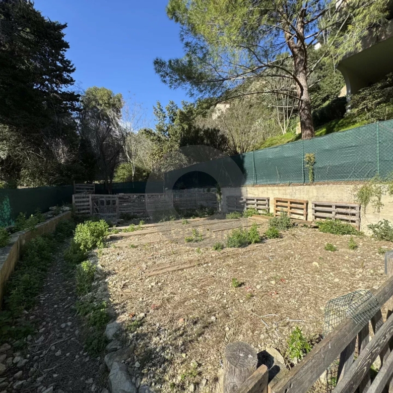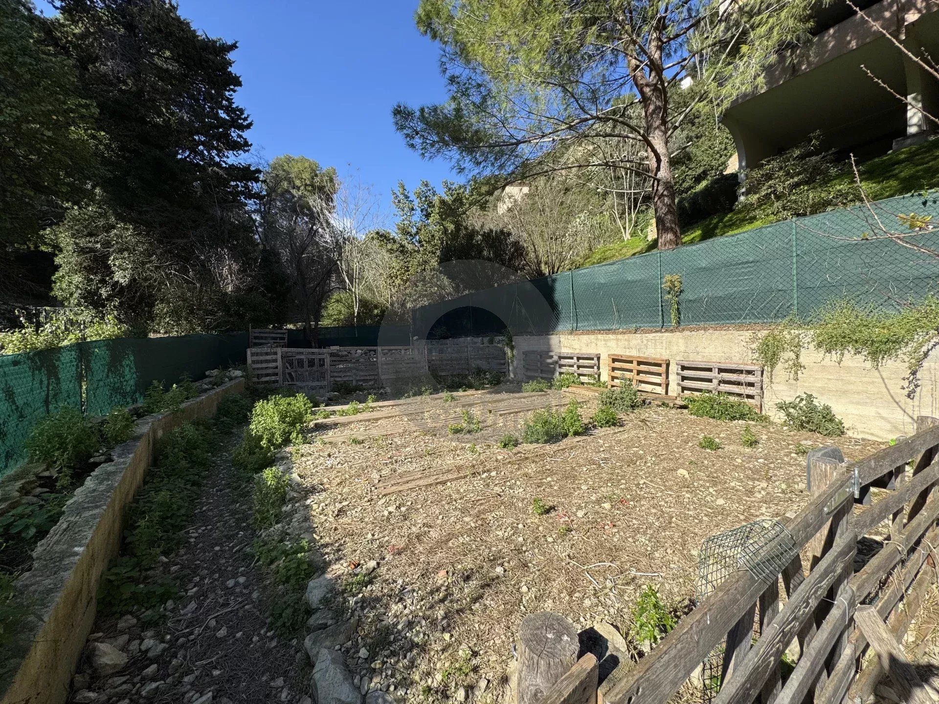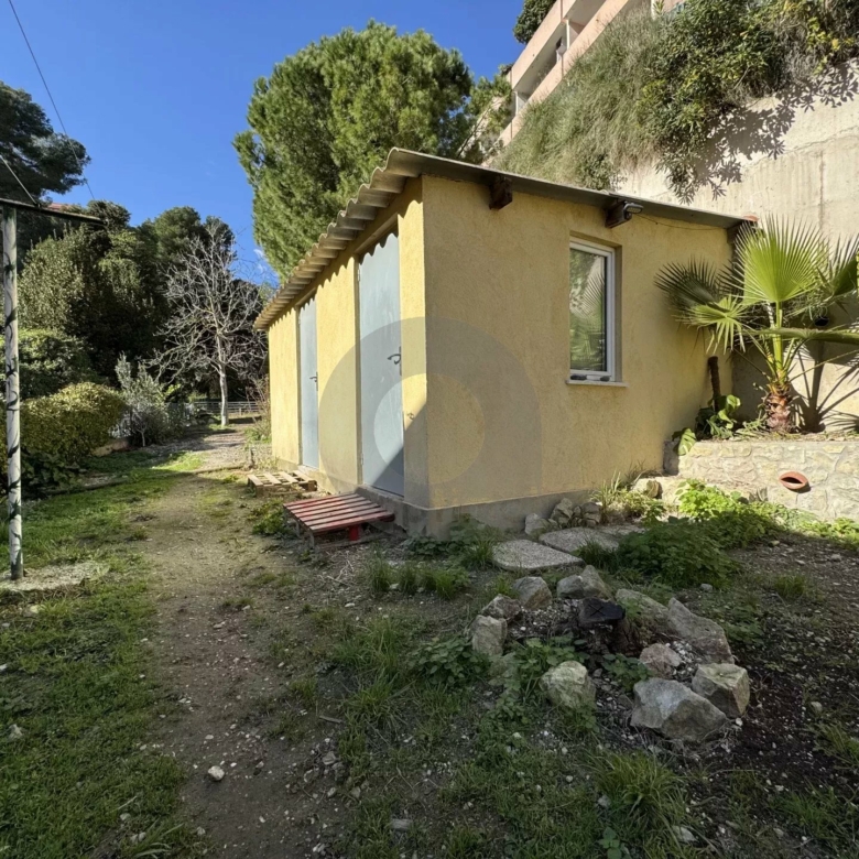 Grande terrasse, jardin plat de 457m2 avec abris et deux cabanons cadastrés (possibilité de créer un studio indépendant, projet disponible sur demande).