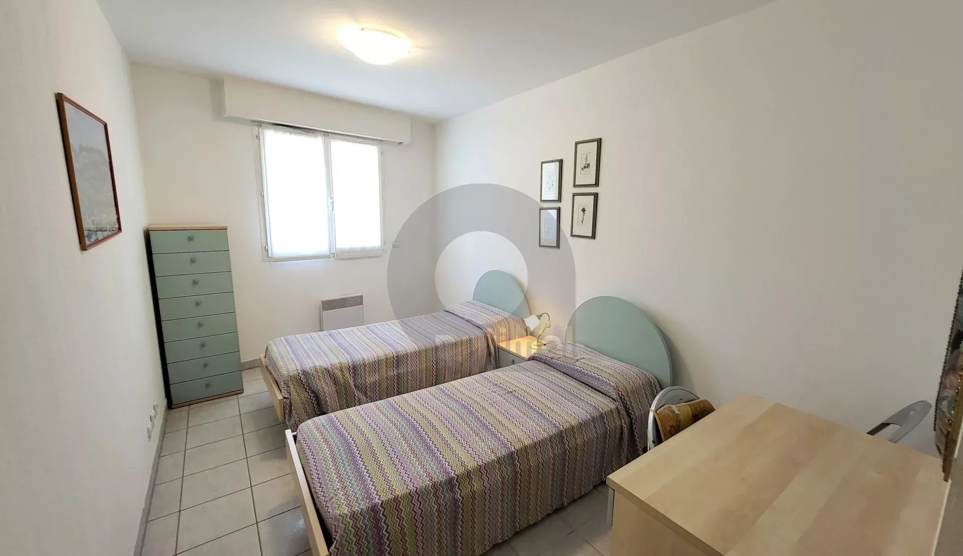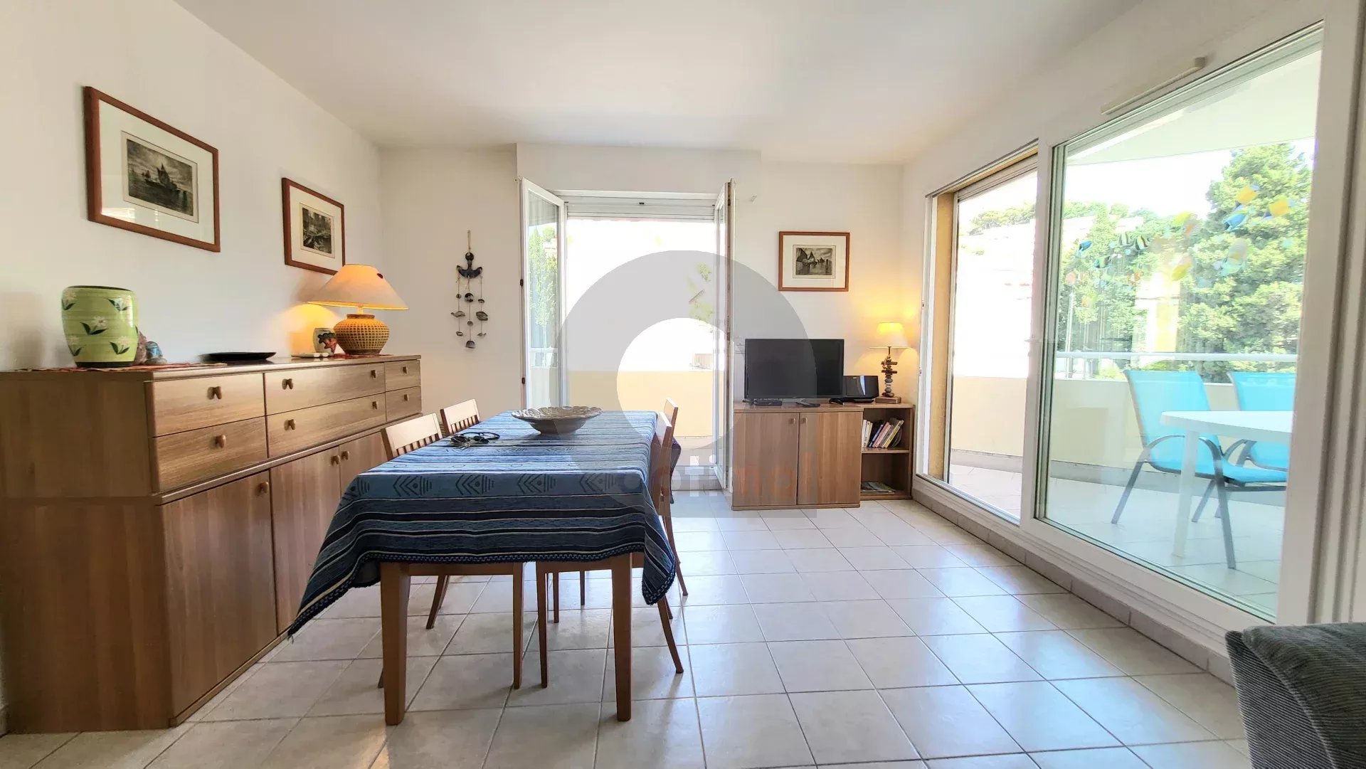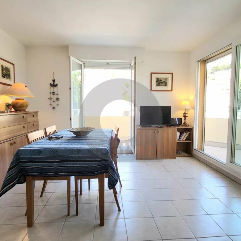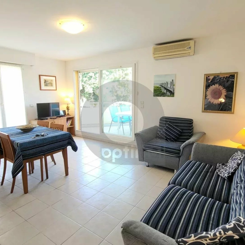EXCLUSIVITY: 150 m from beaches and shops, in a luxury building, pleasant 3-room apartment of approx.68 m² with terrace and garage (+ 40,000 euros). The flat comprises an entrance hall with cupboards, a living room opening onto a terrace, a fitted kitchen opening onto a balcony, a bedroom with cupboards and access to the balcony, a second bedroom, a storage room, a shower room with wc and bidet. In good condition. Bright