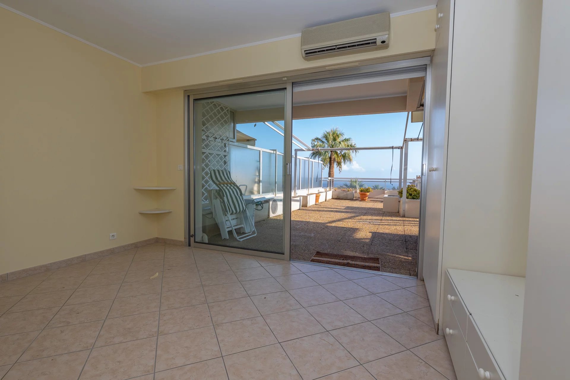 EXCLUSIVITE’ – Charmant trois pièces au calme avec vue panoramique sur la mer et la baie de Menton. Appartement de 71 m² loi carrez exposé au sud et composé d’entrée, séjour, cuisine, deux chambres avec salles d’eau attenantes, WC séparé. Magnifique terrasse vue mer de 90 m². Un garage fermé avec cave.