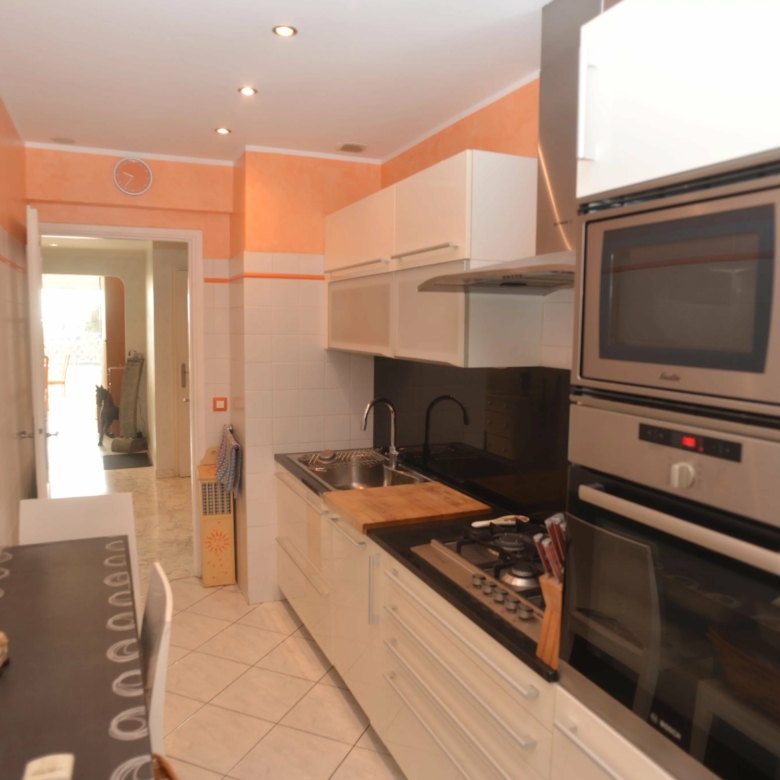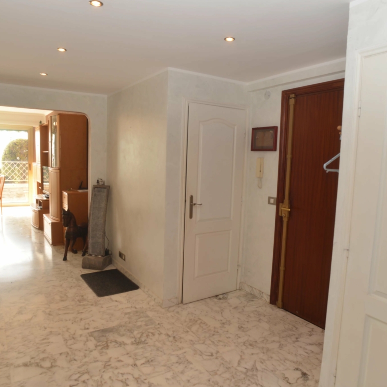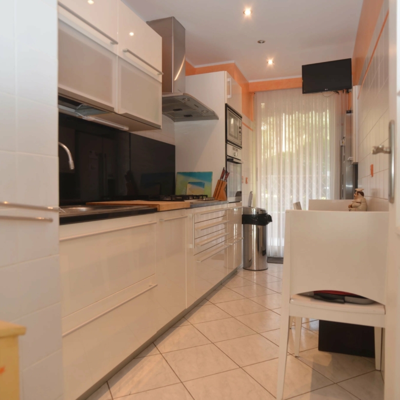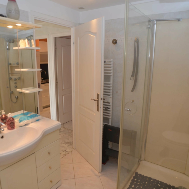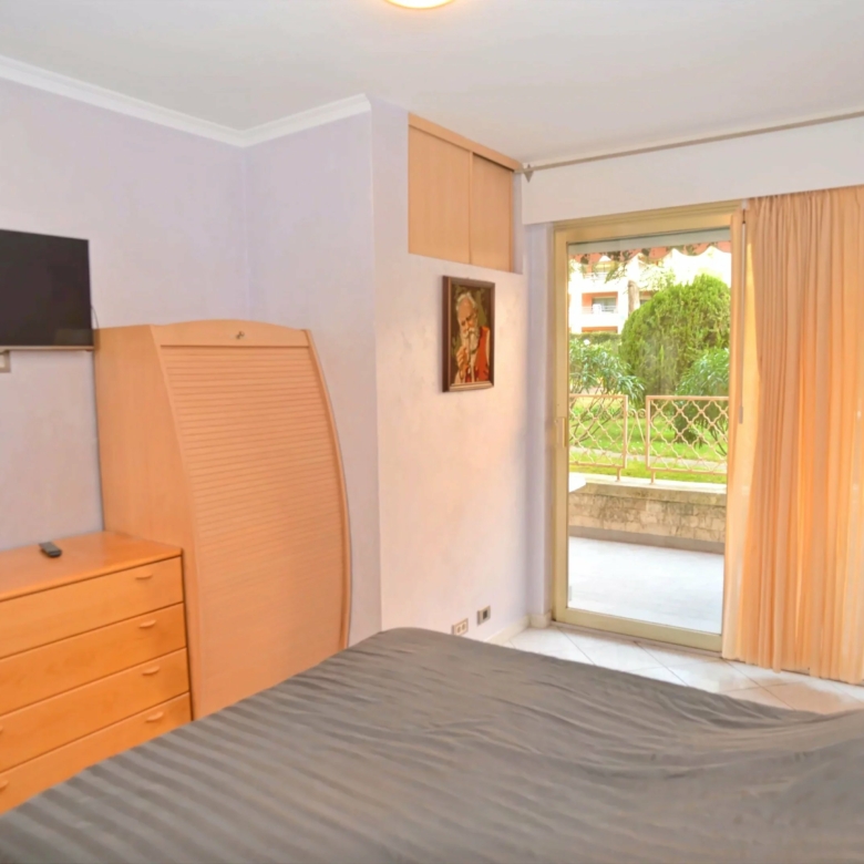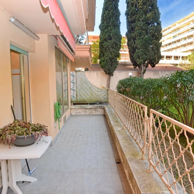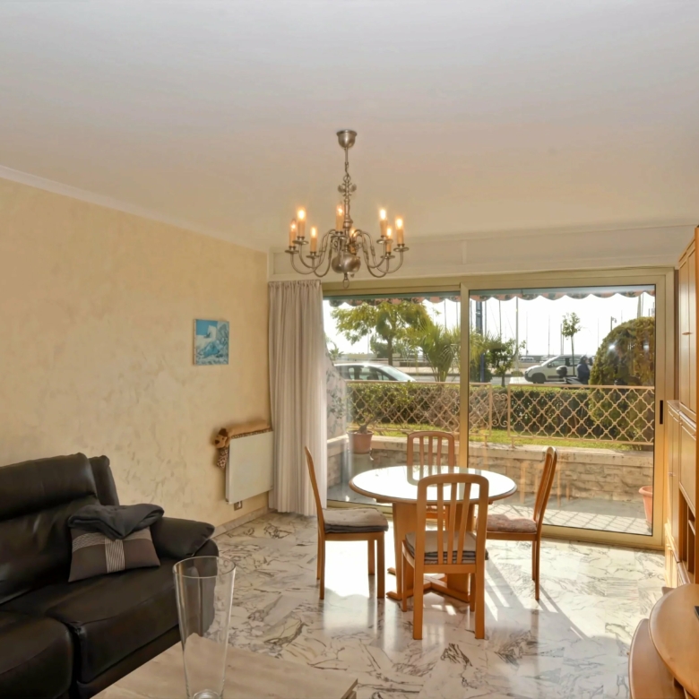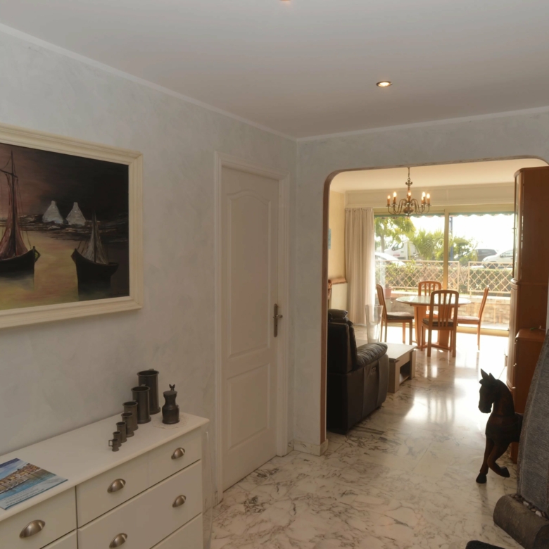 Dans une résidence sécurisée en front de mer, un grand deux pièces traversant de 65 m² avec un balcon au sud de 6 m² et terrasse au calme de 14 m². Il se compose d’une entrée avec placard et débarrasse, un grand séjour – salle à manger donnant sur le balcon exposé sud, une cuisine indépendante toute équipée et grande chambres donnant sur la terrasse au calme avec vue sur le parc de la résidence, une salle d’eau avec douche et WC. Nous avons aimé sa luminosité, ses volumes, la calme et son accès direct aux services (arrêt de bus, gare SNCF, port et bord de mer de Menton Garavan). Un garage au sous-sol est disponible en plus à 52.000€.