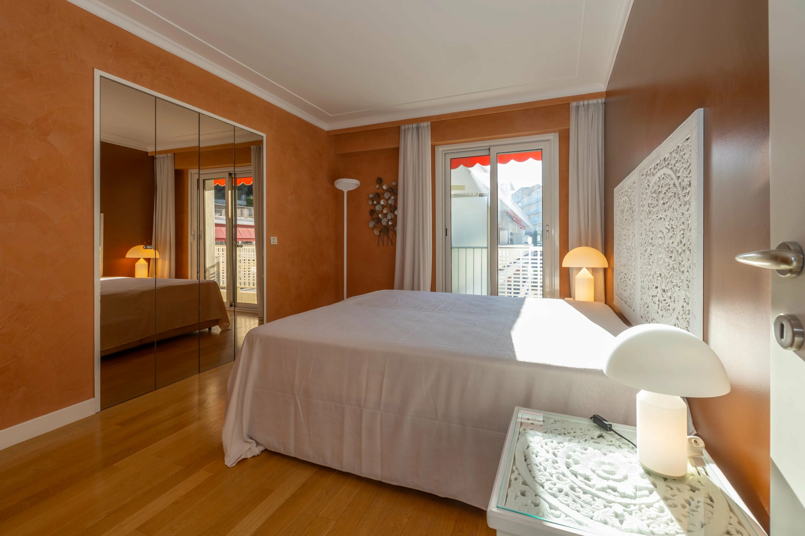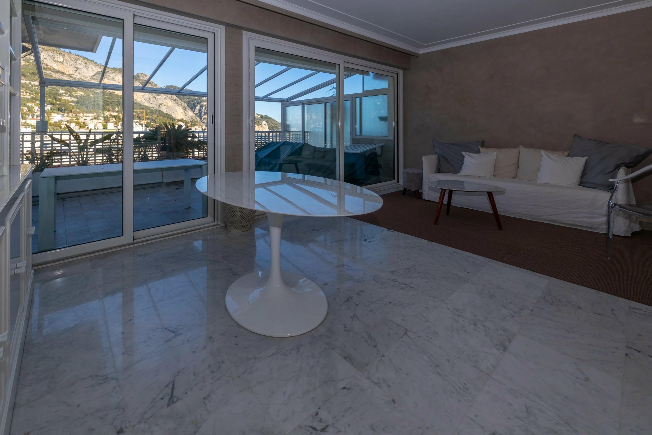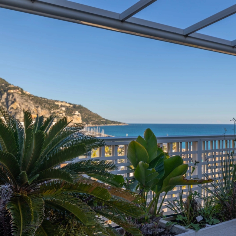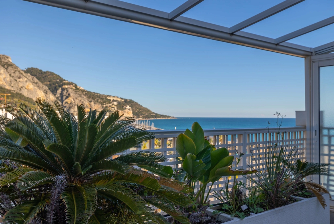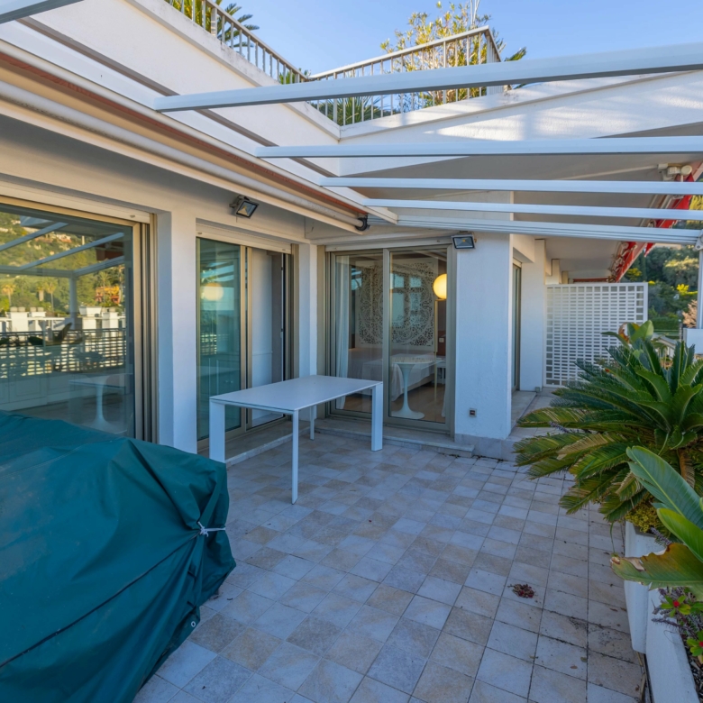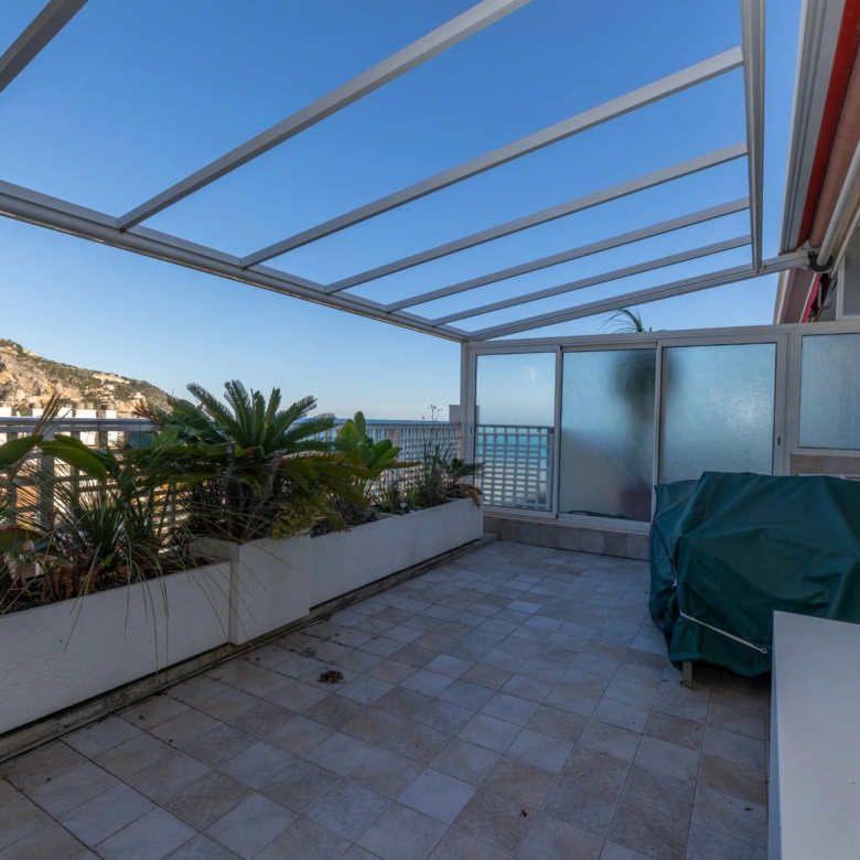 Dans résidence de standing en bord de mer à 2 pas des plages et du centre ; dernier étage avec toît terrasse privatif. Lumineux trois piéces traversant avec vaste séjour sur terrasse avec vue mer, deux belles chambres au calme avec salle de bains, cuisine séparée avec balcon. Solarium privé aménagé avec vue mer panoramique sur la baie de Garavan, le Port et les montagnes.