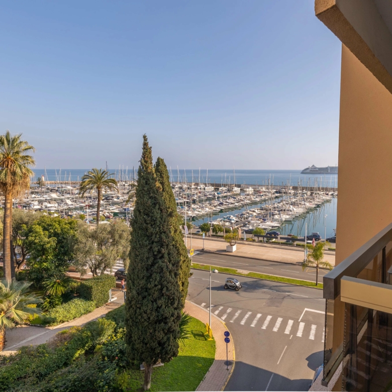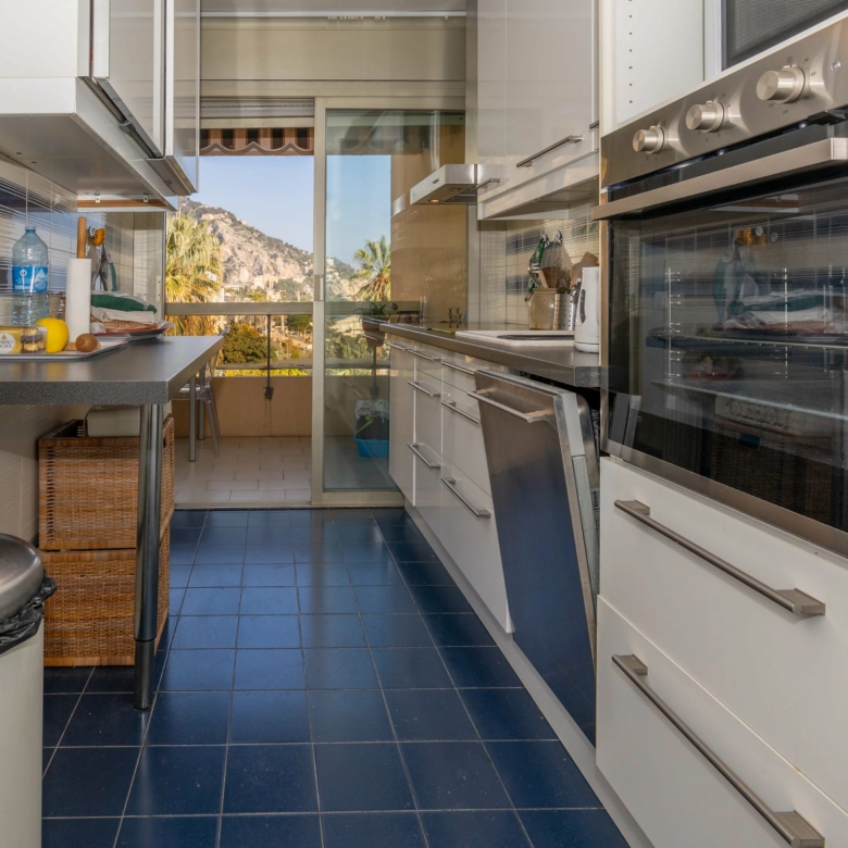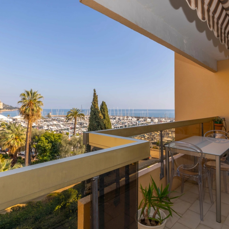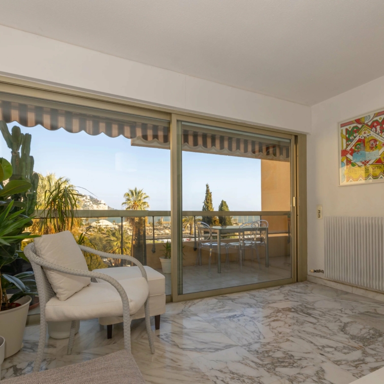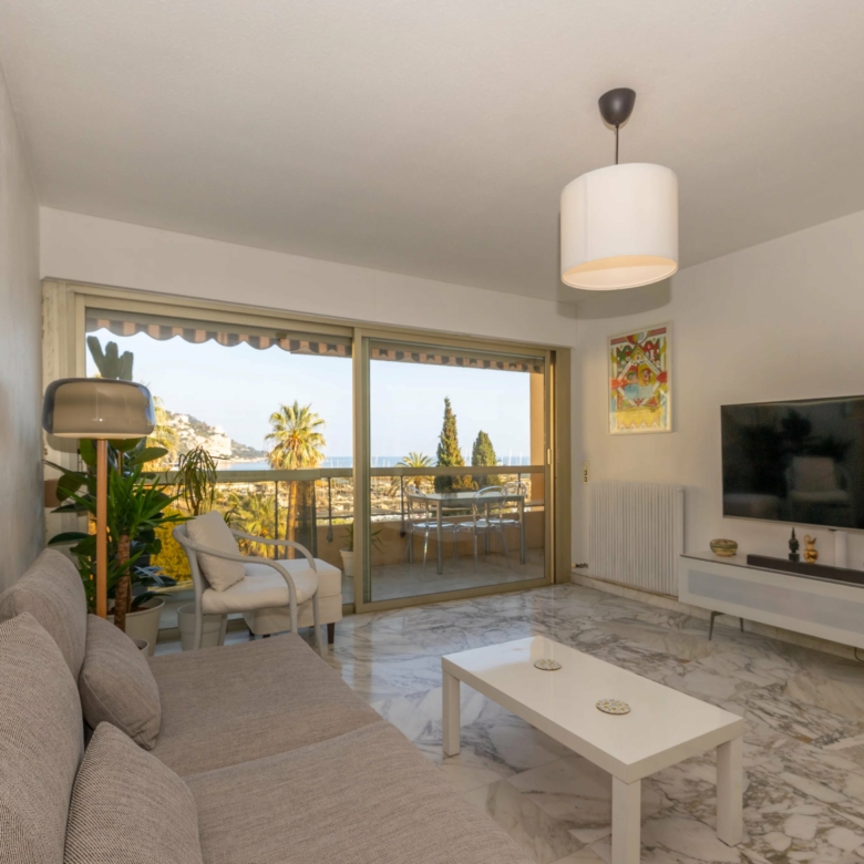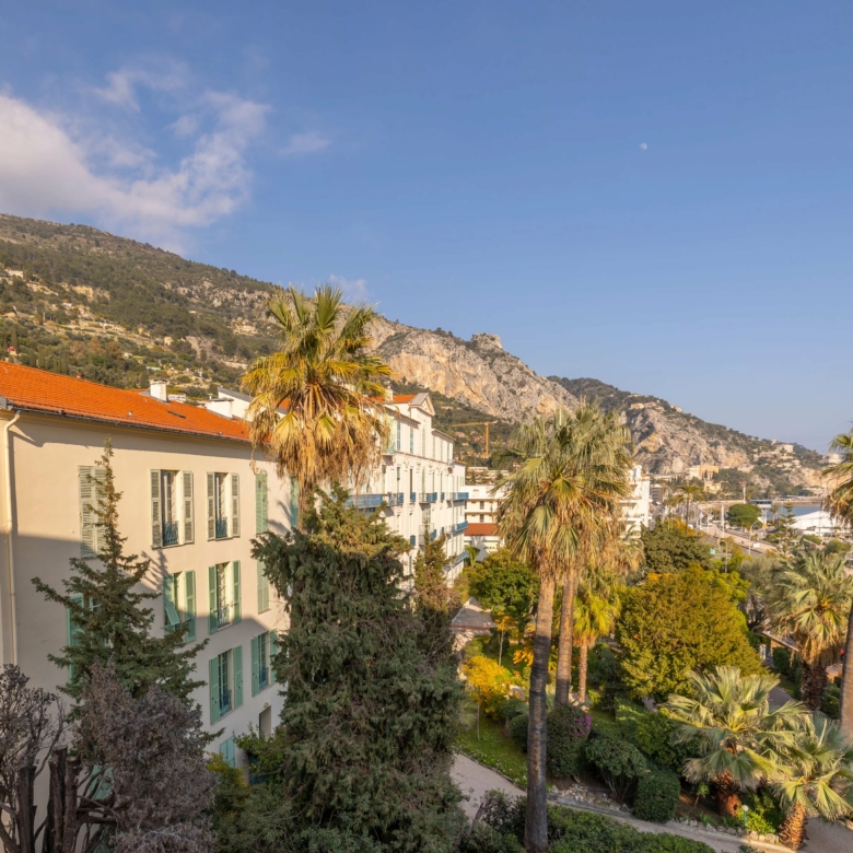 Menton Garavan appartement en étage élevé en parfait état, composé de trois pièces, traversant est-ouest, proche toutes commodités, avec ascenseur dans une résidence de standing récemment ravalée. L’appartement mesure environ 60 m² loi carrez et bénéficie d’une vue panoramique sur les collines, la mer et le port de Menton Garavan. Se compose d’entrée, séjour et cuisine séparée ouverts sur la terrasse, une chambre avec balcon à ouest, autre chambre, salle de bains neuve avec douche à l’italienne, toilettes séparées, dégagement. Cave. Un garage dans le sous-sol de la résidence est disponible à la location à 150€/mois.