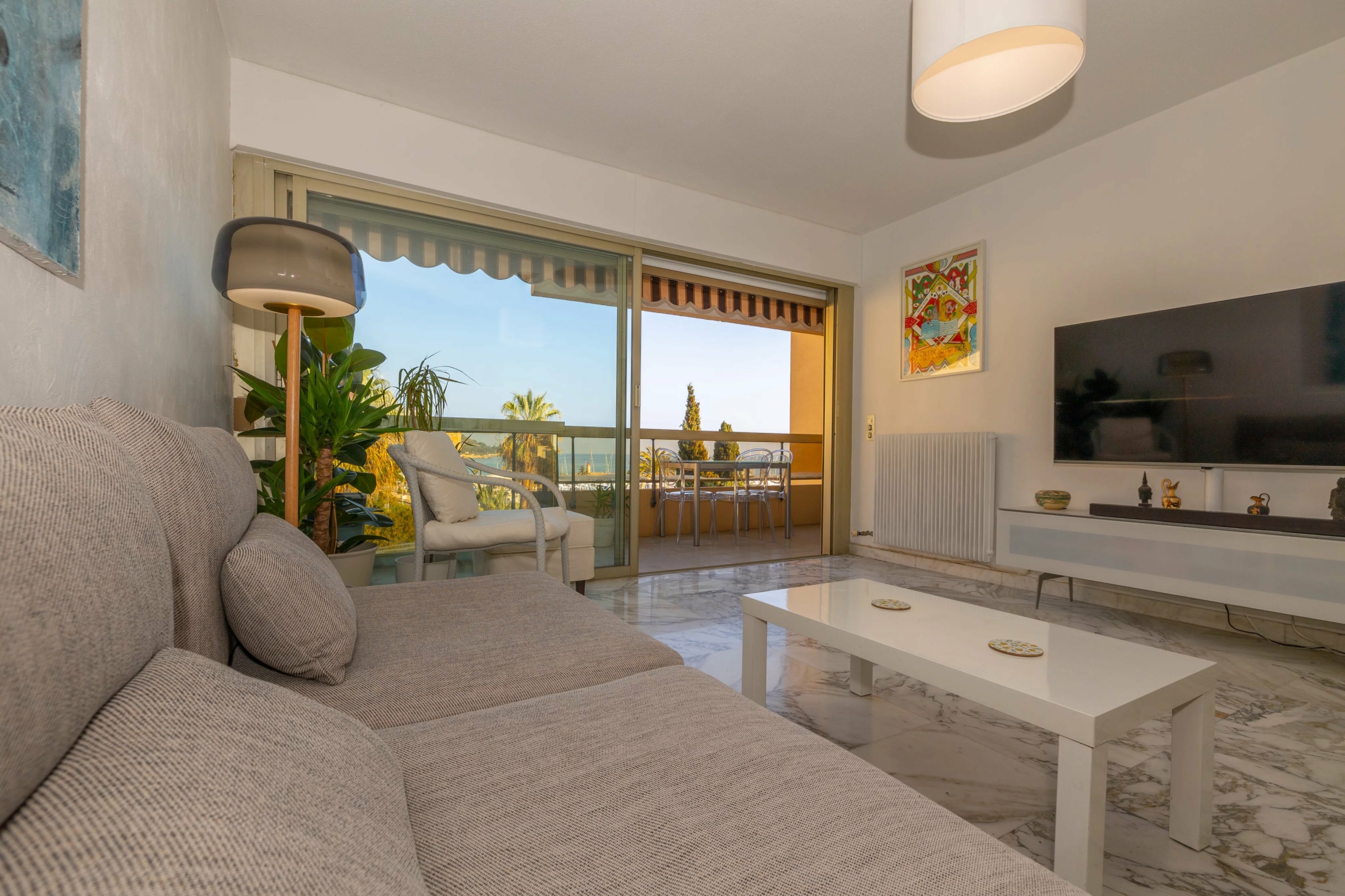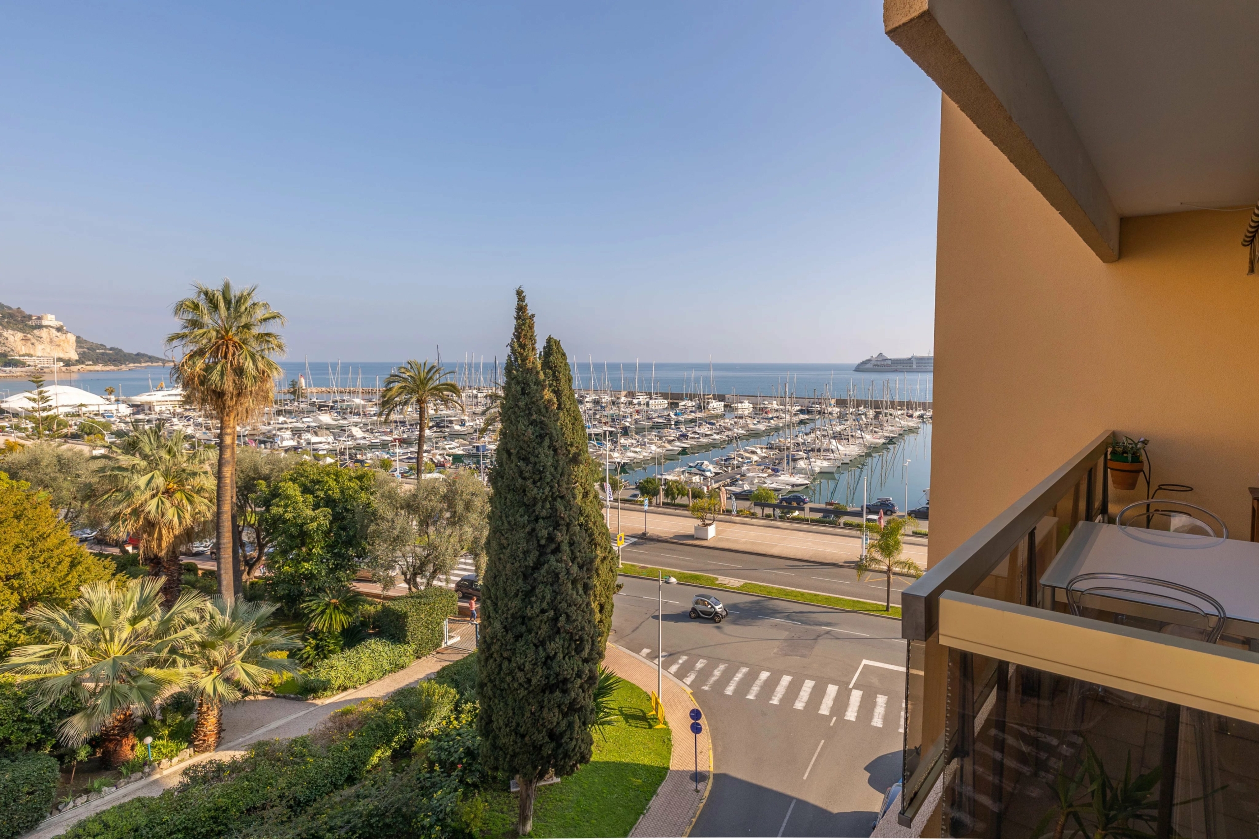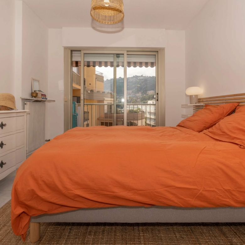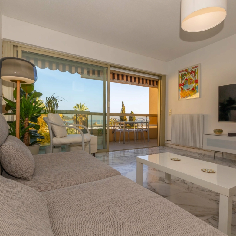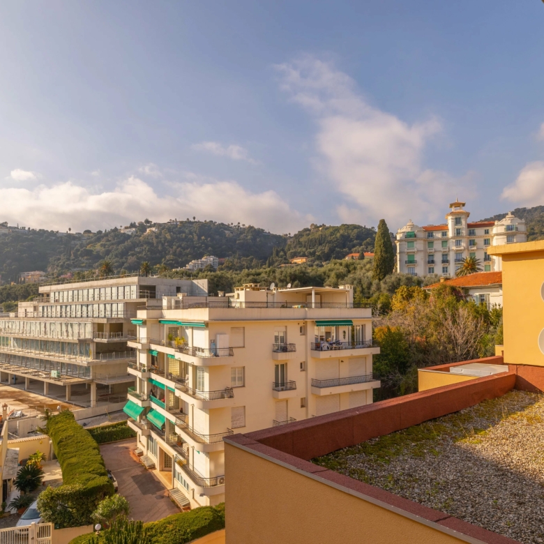 Menton Garavan appartement en étage élevé en parfait état, composé de trois pièces, traversant est-ouest, proche toutes commodités, avec ascenseur dans une résidence de standing récemment ravalée. L’appartement mesure environ 60 m² loi carrez et bénéficie d’une vue panoramique sur les collines, la mer et le port de Menton Garavan. Se compose d’entrée, séjour et cuisine séparée ouverts sur la terrasse, une chambre avec balcon à ouest, autre chambre, salle de bains neuve avec douche à l’italienne, toilettes séparées, dégagement. Cave. Un garage dans le sous-sol de la résidence est disponible à la location à 150€/mois.